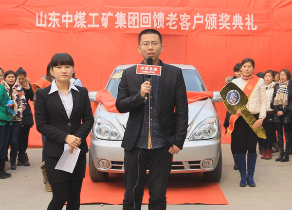 頒獎典禮上,中煤集團副總經理李振波致辭,李總說,首先恭喜東泰機械的張總獲得我們的汽車大獎。中煤集團的發展壯大離不開新老客戶的支持與信賴,我們舉辦積分返利抽獎活動,就是為了大限度的回饋新老客戶,新的一年我們將繼續加大客戶優惠力度,歡迎更多的朋友來中煤洽談合作!