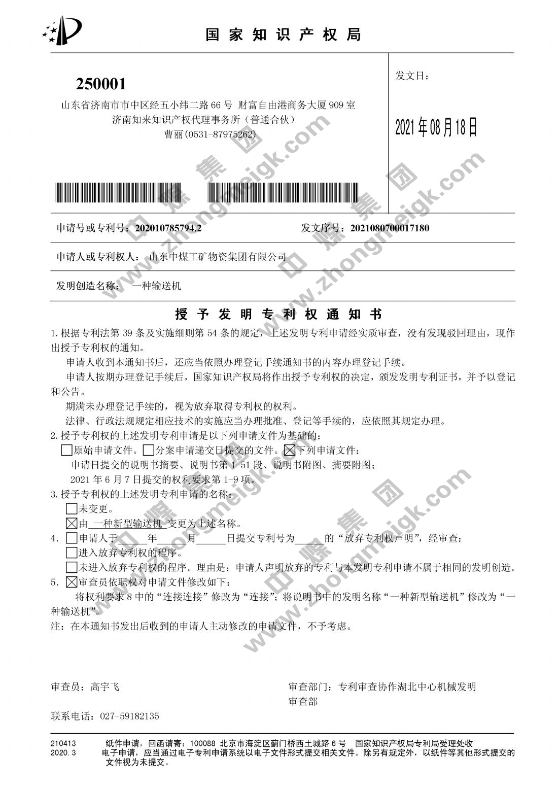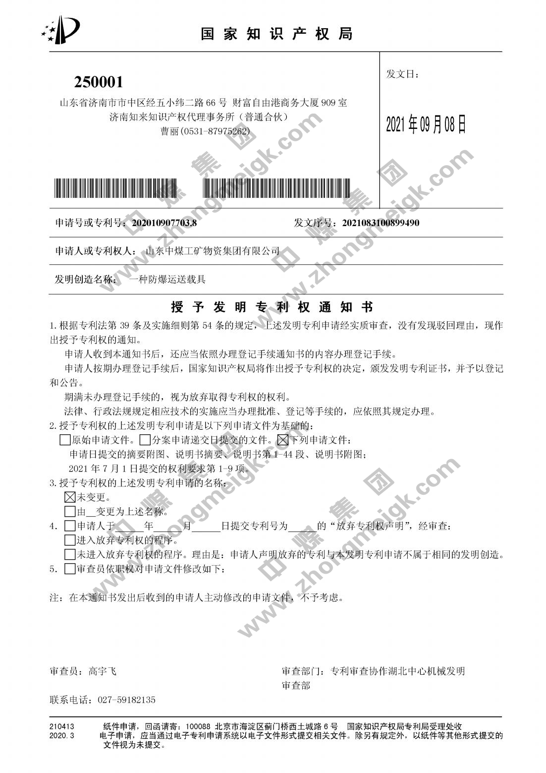 近日,由中煤集團制造總公司自主研發生產的“一種具有挖掘功能的載具設備”、“一種輸送機”、“一種防爆運送載具”3項發明專利產品成功獲得國家知識產權局授權,并取得“授予發明專利權通知書”。這是我集團在智能裝備技術創新領域的又一突破,標志著集團的科技創新研發能力又一次技術領域的新突破,為推動企業高質量發展提供了有力支撐。